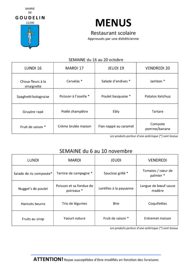 Les menus du restaurant scolaire de Goudelin