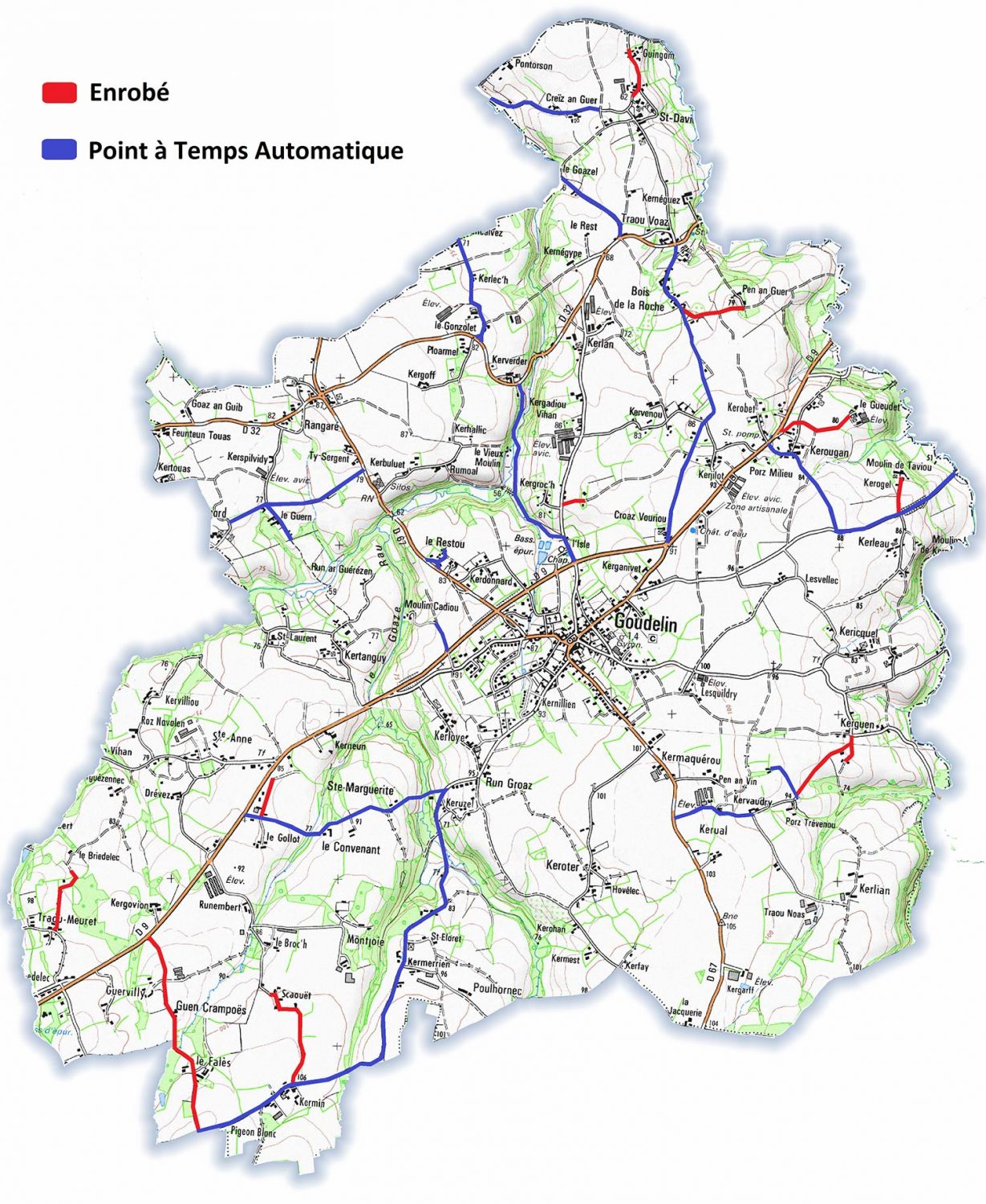 En parallèle sont menés des travaux d’entretien en Point à Temps Automatique, pour lequel un contrat a été signé avec le Conseil Départemental pour les faire, et dont les routes reprises sont signalées en mauve sur la carte.