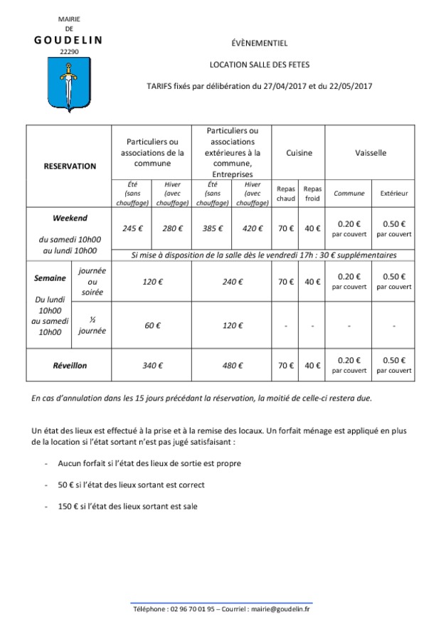 Les tarifs ont étés fixés par délibération du 27/04/2017 et du 22/05/2017 pour réserver la salle contactez la mairie Téléphone : 02 96 70 01 95
